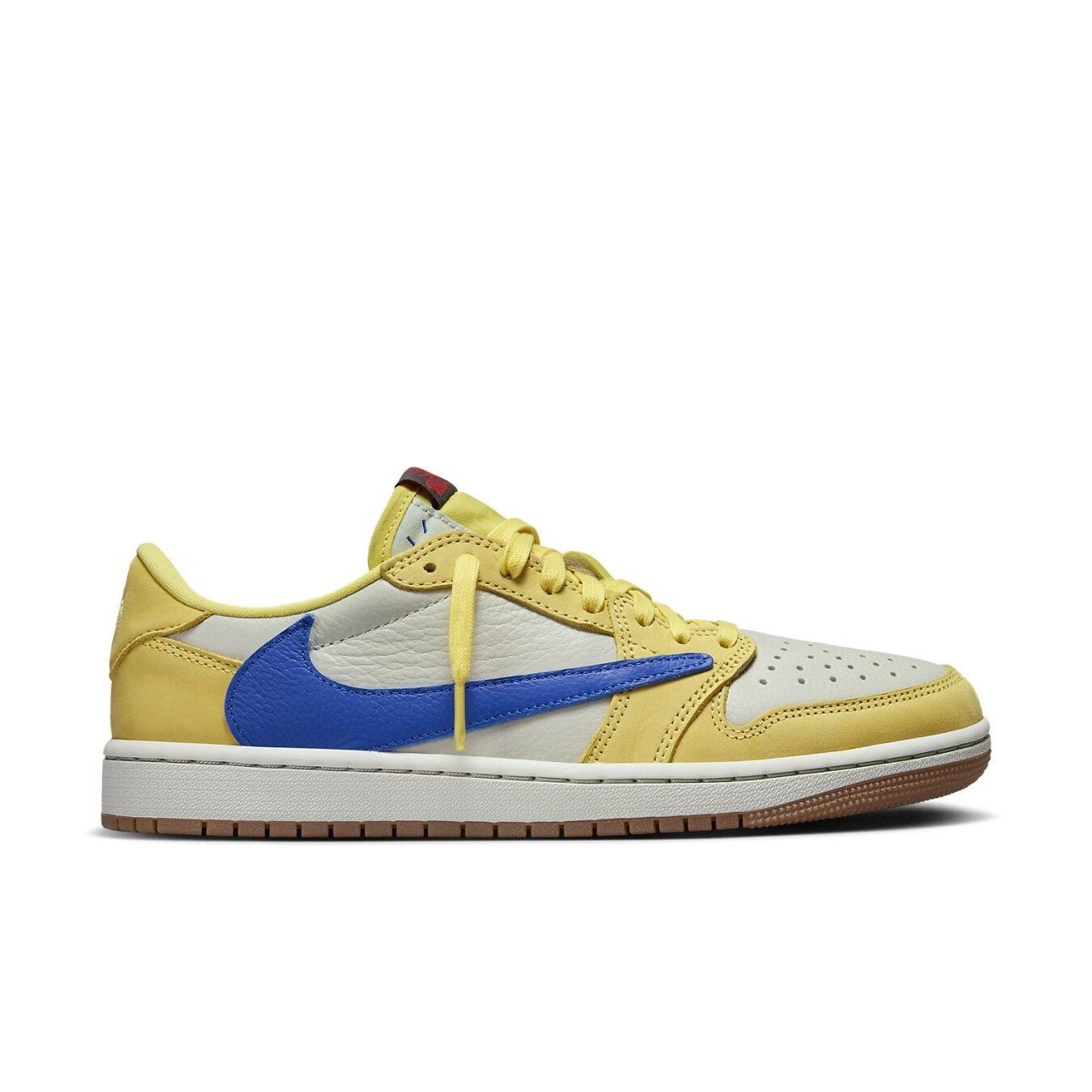 La Travis Scott x Women’s Air Jordan 1 Retro Low OG SP ‘Canary’, conosciuta anche come ‘Elkins’ in omaggio alla scuola superiore di Travis Scott, presenta il caratteristico Swoosh inverso del rapper di Houston in Racer Blue sul lato laterale. Il design include una tomaia in pelle bianca contrastata da sovrapposizioni gialle sull’avampiede e sul tallone, aggiungendo un tocco vivace. La linguetta è adornata con un’etichetta Nike Air rossa e nera, mentre il branding Cactus Jack e Jordan Wings in bianco è ricamato in modo disomogeneo sulle linguette del tallone di ciascuna scarpa. La sneaker è supportata da una suola cupsole tradizionale, accentuata da pareti laterali testurizzate bianche e una suola in gomma per un tocco finale classico.