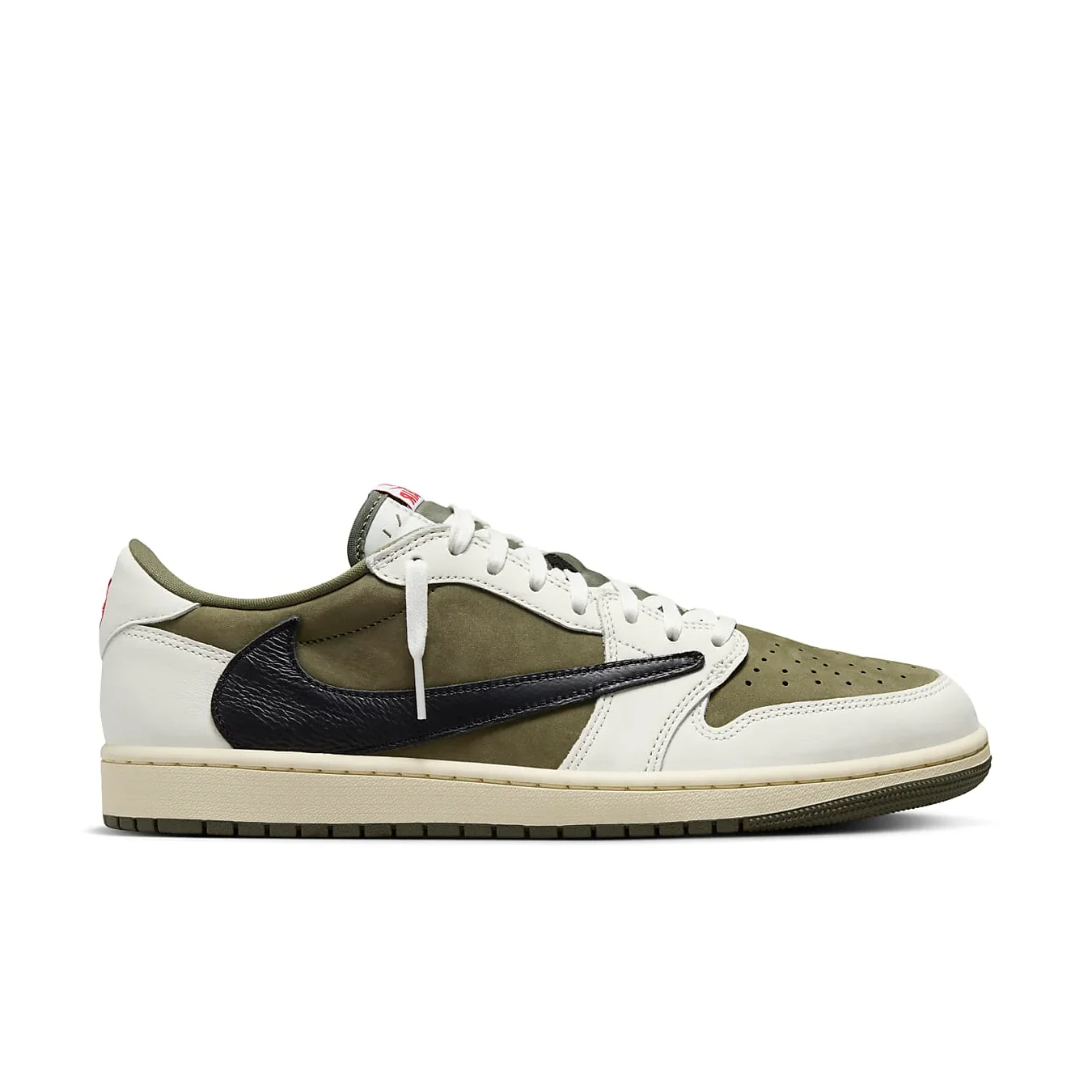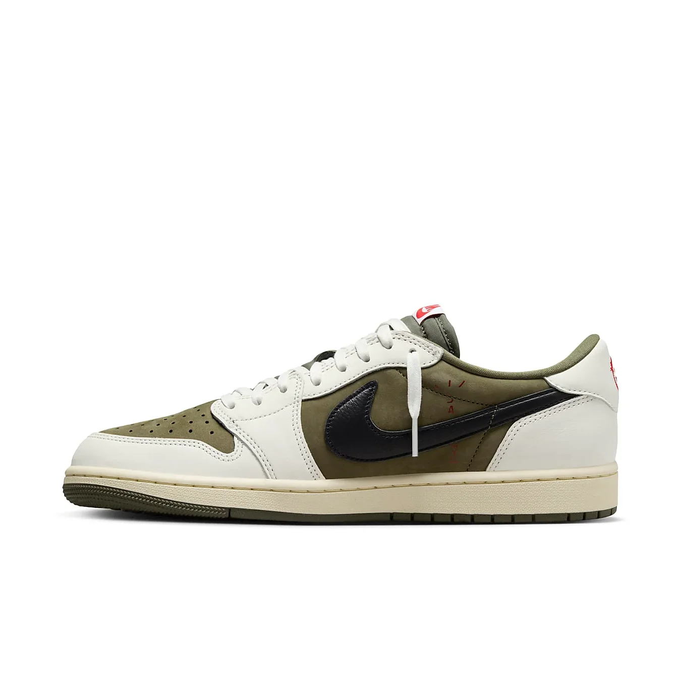 La Travis Scott x Air Jordan 1 Low OG SP ‘Medium Olive’ presenta una tomaia in suede verde oliva, contrastata da sovrapposizioni in pelle bianco gesso sull’avampiede e sul tallone, per un look audace e raffinato. Il caratteristico Swoosh inverso di Scott è presente sul lato laterale in pelle martellata nera, aggiungendo un elemento di design distintivo. Accenti cremisi appaiono sull’etichetta Nike Air della linguetta e sulle linguette posteriori in pelle, contrassegnate dai marchi Jordan Wings e Cactus Jack in modo disomogeneo. La sneaker è montata su un’intersuola color avorio vintage, che aggiunge un tocco retrò, mentre una suola in gomma verde oliva offre eccellente trazione e durata.