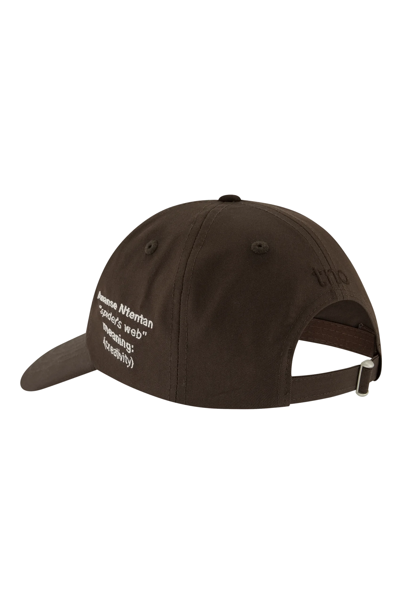 the ananse adinkra cap in acid brown features the ananse ntentan symbol embroidered on the front, representing the spider’s web, an adinkra sign from west africa symbolizing creativity.